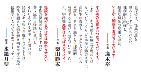 書籍96ページ分 試し読み(マイナビ出版さんのnote) 久青玩具堂の偏愛作品10選(マイナビ出版さんのnote) ホンモノの 「頼むよ 別れたカノジョが学校のオカルト研究会に入って、自分に呪いをかけようとしているというのだ。臆病な高野に拝み倒されて、境太郎はオカルト研究会の実態を探るべく部室を訪ねる。 そこで彼は、自分よりも強烈な眼力を持つ少女に出会った。 彼女の名は 「おっ、オカルトに、興味があるんだね? ジャンルはなにかな? 妖怪? 宇宙人? 地方の因習? それともAIの不可思議な挙動? バックドアとかリミナルスペースとかはあんまり詳しくないけど、興味があるならもちろん取り扱うし……あっ、創作怪談は研究の対象外なんだけど考察のとっかかりとしてはありだし遠慮しないで――」 入部希望者と間違われ思わぬ歓待を受けた境太郎は、見学と称して研究会のフィールドワークに同行することになる。 それは、学内のネット掲示板に寄せられた怪談話が「ホンモノ」か否か、知恵を尽くして検証するオカ研の主活動だった。 「ひ、ひひ……ひっ。 きっと……なにかには出会えるよ。あたしは、歩けば棒に当たる犬だからね」 天狗に友人をさらわれたという少年の手記を読み解く「天狗の怪」 男たちの局部を幾度となく切って落としたという妖刀、その呪いの正体を考察する「羅切丸の怪」 奇妙な構造と来歴を持ち、住む者を翻弄した怪建築の真意をひもとく「両喜亭の怪」 オカルト研究会に寄せられた3つの怪奇譚。そしてそれを検証する部員たちの奮闘。 理世はなぜホンモノの怪談を探し求め、謎を解くたびに溜息を吐くのか。ついでに高野は呪われてしまうのか。 奇妙でユーモラスな連作ミステリです。 ![]() (※発売後に追加予定) |